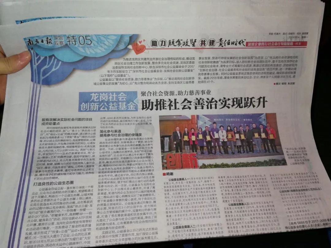 2019年,南方日报、南方+启动“深圳企业(机构)践行社会责任点赞”活动,通过超84万人次的网络投票及专家评审打分,从百余个企业(机构)、公益项目中,评选出包括“2018年度责任企业”“2018年度公益企业(机构)”“2018年度公益项目”奖项。其中,由深圳市社会公益基金会承办的“龙岗区体育关爱工程”获得了“2018年度公益项目”奖项。